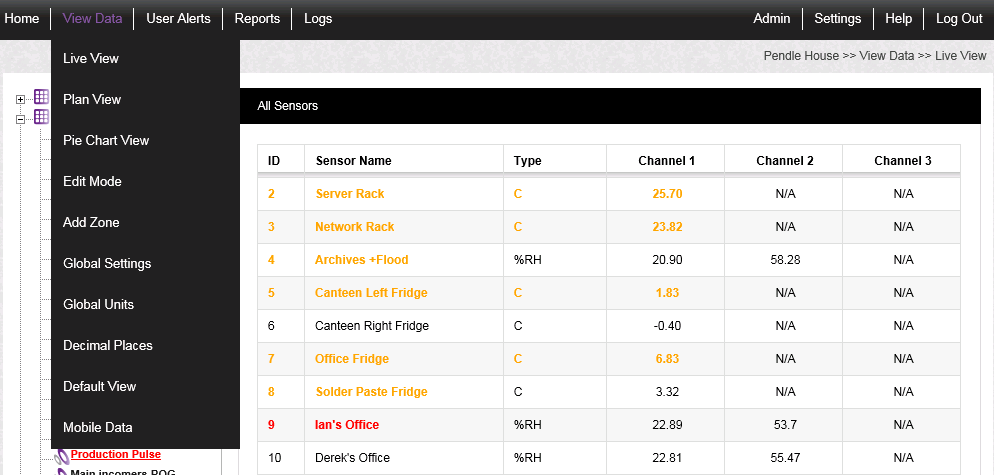 4.In the left-hand menu, click on the Sensor name that you wish to view the Sensor Data for.